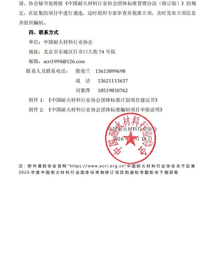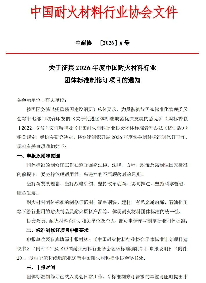 注:附件請(qǐng)到協(xié)會(huì)官網(wǎng)“https://www.acri.org.cn”中國(guó)耐火材料行業(yè)協(xié)會(huì)關(guān)于征集2026年度中國(guó)耐火材料行業(yè)團(tuán)體標(biāo)準(zhǔn)制修訂項(xiàng)目的通知專題板塊下載獲取。