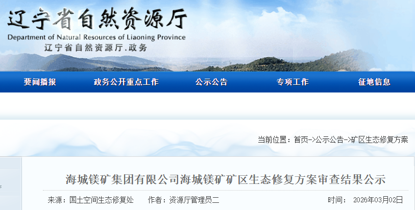 根據(jù)《土地復(fù)墾條例》和《遼寧省地質(zhì)環(huán)境保護(hù)條例》有關(guān)要求,我廳委托自然資源事務(wù)服務(wù)中心組織專家對(duì)《海城鎂礦集團(tuán)有限公司海城鎂礦礦區(qū)生態(tài)修復(fù)方案》進(jìn)行了審查?,F(xiàn)將擬同意通過的該方案及專家評(píng)審意見進(jìn)行公示,公示期自發(fā)布之日起5個(gè)工作日。