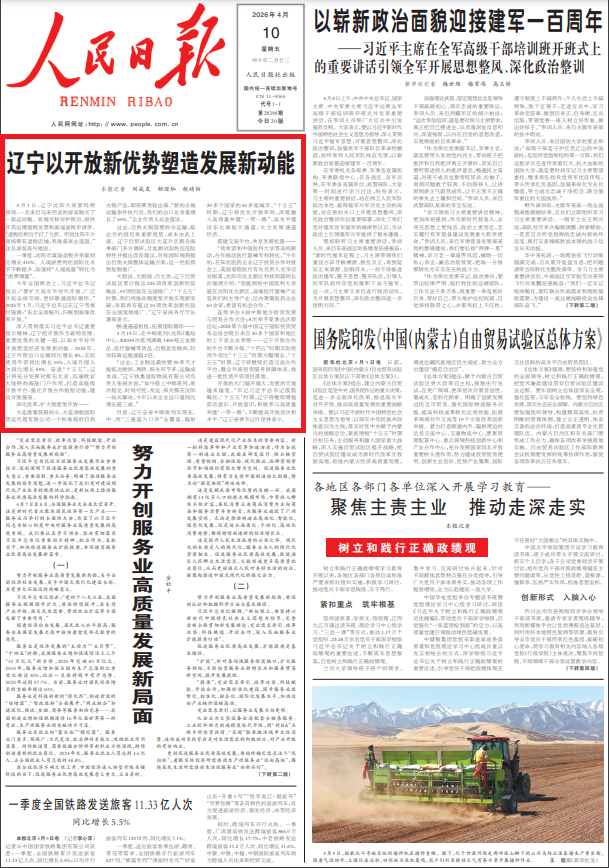 2026年4月10日,人民日?qǐng)?bào)頭版頭條刊發(fā)《遼寧以開(kāi)放新優(yōu)勢(shì)塑造發(fā)展新動(dòng)能》,全文如下: