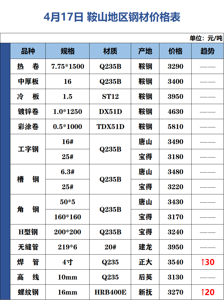 4月17日 鞍山地區(qū)鋼材價格表